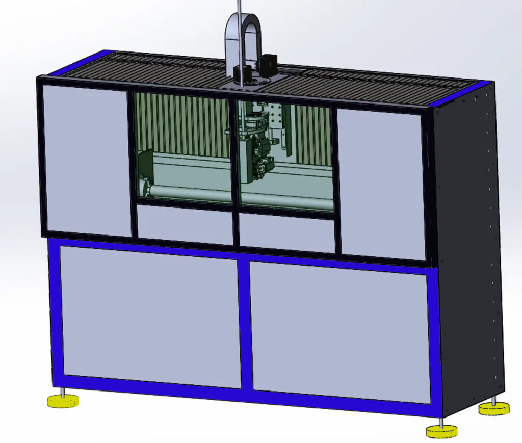 Машина имеет не менее 5-ти управляемых сервоприводов осей перемещения или вращения. По оси Х (продольное перемещение) ход 1050 мм, по оси Y (поперечное перемещение) ход не 85 мм. Ось Z – подача ленты, скорость 15 м\мин. Ось А – вращение оснастки, скорость не 300 об\мин. Ось В — угол поворота головы с лазером от -75 до +75 градусов.